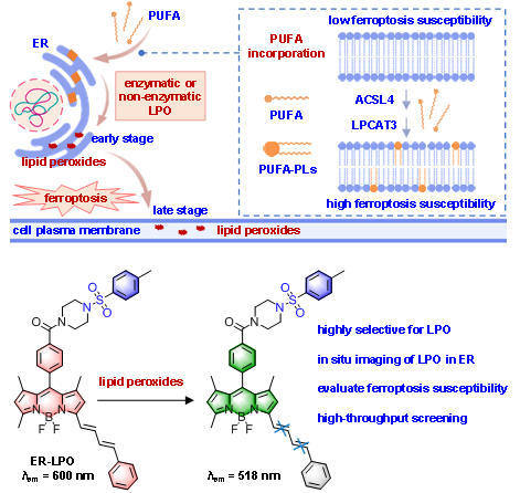 评估细胞对铁死亡的敏感性(由脂质过氧化LPO驱动的程序性细胞死亡过程),对于理解相关疾病发病机制及开发靶向治疗策略至关重要。我校袁泽利教授课题组与中国科学院化学所马会民研究员课题组合作,依据内质网(ER)是铁死亡过程中LPO最早积累的位点,提出了通过监测ER中的LPO新策略。该策略创建了一个靶向ER的荧光探针ER-LPO,探索其监测ER内的LPO过程,并评估细胞铁死亡敏感性及中药材中抗铁死亡有效成分的筛选。该研究表明:ER-LPO对LPO表现出快速、灵敏且选择性的荧光响应,并可通过ER-LPO成像技术,监控铁死亡过程中ER膜上LPO的动态积累,该过程与细胞存活率下降密切相关,但与铁死亡诱导途径和细胞系无关。研究中还发现,通过补充多不饱和脂肪酸(PUFA)或增强ACSL4催化的PUFA同化作用以增加膜磷脂中的PUFA含量,可加速LPO进程并提高细胞对铁死亡的敏感性;相反,补充单不饱和脂肪酸或抑制ACSL4以阻断PUFA摄取,则能降低LPO水平并增强细胞的铁死亡抗性。该研究将进一步用于天然药材中抗铁死亡有效成分的高通量筛选,鉴定出黄芩素(一种三羟基黄酮衍生物)可作为高效的铁死亡抑制剂,这可能是由于其自身的抗氧化能力和脂氧合酶抑制活性。
