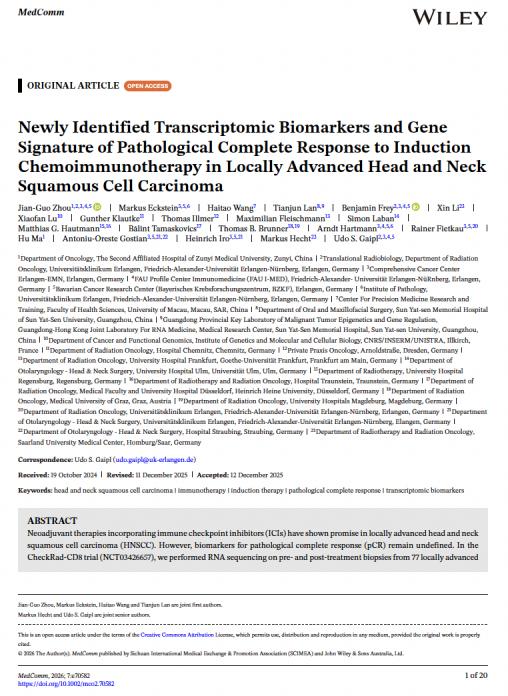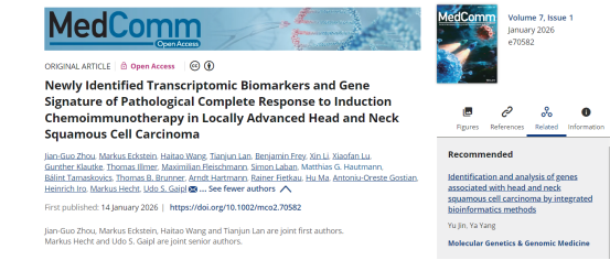 近日,我校第二附属医院马虎教授团队在期刊《MedComm》(IF= 10.70,中科院和JCR双一区,TOP期刊)上发表题为 “Newly Identified Transcriptomic Biomarkers and Gene Signature of Pathological Complete Response to Induction Chemoimmunotherapy in Locally Advanced Head and Neck Squamous Cell Carcinoma”的原创性研究论文。第二附属医院周建国主任医师为该论文第一作者,学校国际合作导师Udo Gaipl 教授和Markus Hecht教授为通讯作者。该研究得到国家自然科学基金、国家重大科技专项等支持。